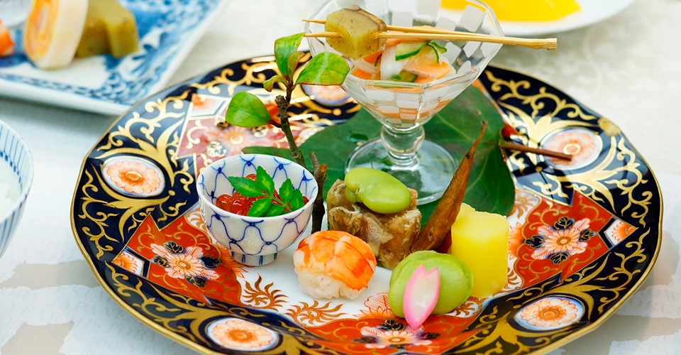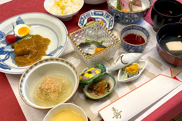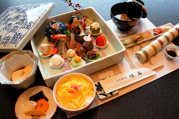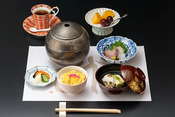 当店オリジナル「寿づくし」の陶箱弁当です。季節の美味しいものを陶箱の中に詰めました。有田焼の美しい器を使った、目でも楽しんでいただけるランチとなっております。有田名物の呉豆腐もご賞味いただけます。