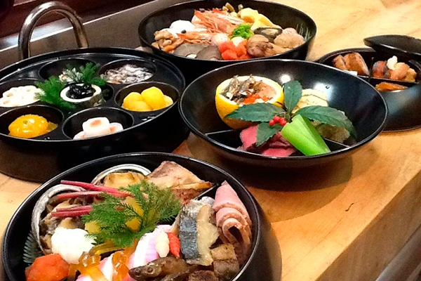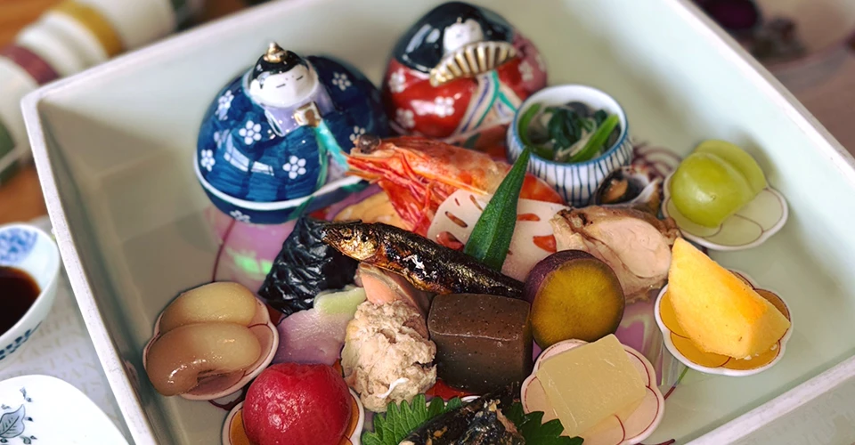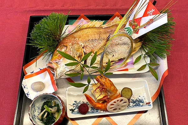 お祝いに普通のお弁当では味気ない。そんな方には宝袋弁当をお勧めします。宝袋の形状の焼物の中に季節折々のお料理が入っています。